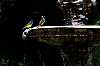 Depois de se refrescar do calor dos trópicos, a estátua tocou uma canção para o bem-te-vi e cedeu a fonte de água para ele namorar sob sua proteção.